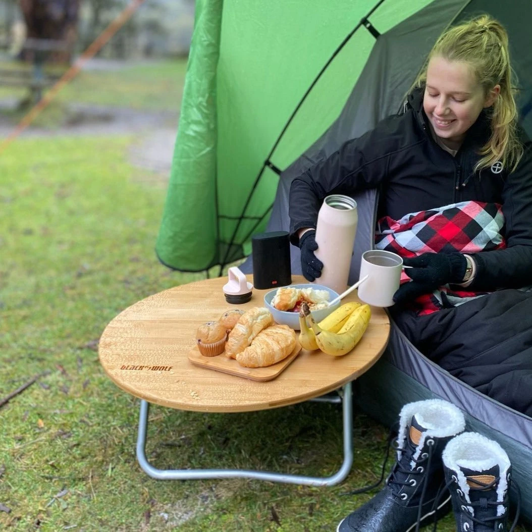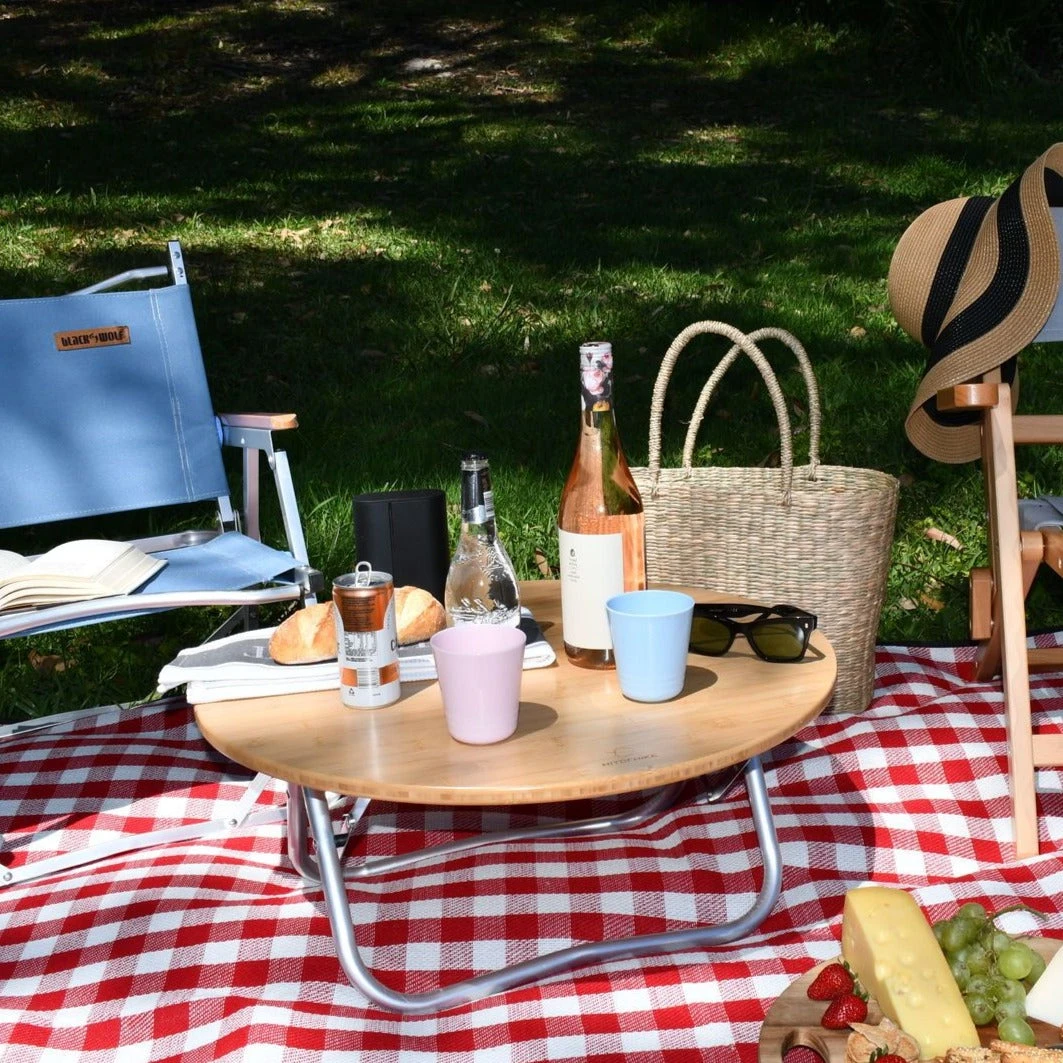 Sitting down for your picnic and the ants have invaded the rug? Thatโs no place to serve your food. This super cute fold down picnic table sits low to the ground so you can relax and keep the glass off the ground and the cheese platter safe. Made from bamboo and an aluminium frame, this convenient and compact table packs into its own bag, is weather resistant and easy to clean.ย