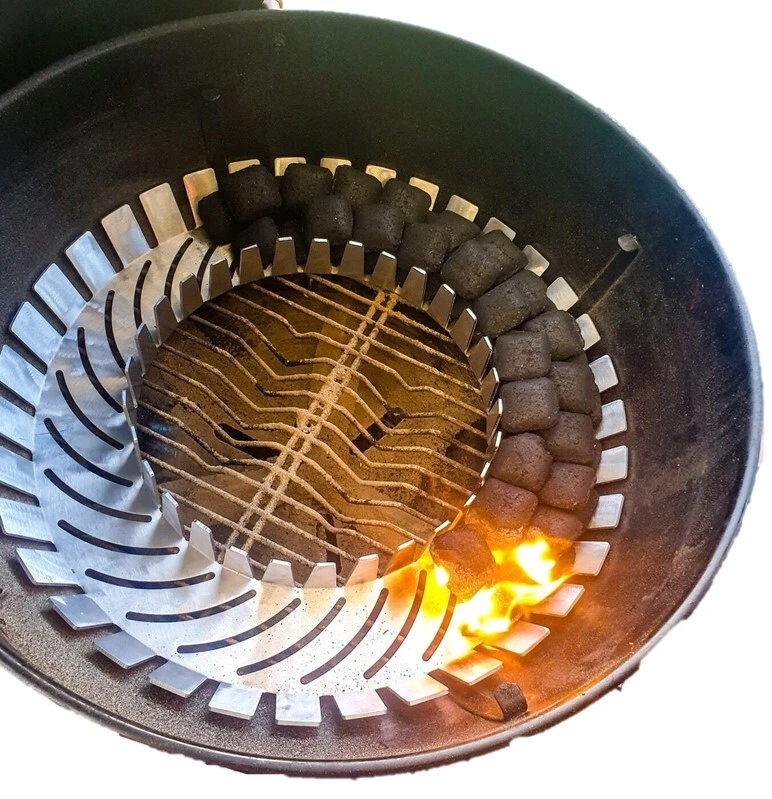 Building a ‘Snake’ in the Snake Pit: The Snake Pit is designed for use with all types of solid barbecue fuels. Use the following method for building a snake for consistent and repeatable results when using charcoal briquettes: 1): The outside bottom row of briquettes stand against the outside fingers of the ring shoulder-to-shoulder style. 2): The inside bottom row is placed like fallen dominoes, laying onto each other. 3): The top row is placed to lay onto each other like the inside bottom row. 4): Place a small amount of lit coals at the head of the snake and away you go for hours of beautifully consistent temperatures. For best results, the lid damper on your kettle should be positioned wide open while using the lower vent(s) for adjusting to your desired temperature. You can also use extruded fuels or lump charcoal (or a combination) to form a snake too.
